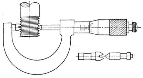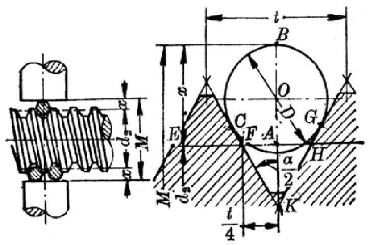 測(cè)量時(shí),將三根精度很高、直徑相同的量針?lè)旁诒粶y(cè)螺紋的牙凹中,用測(cè)量外尺寸的計(jì)量器具如千分尺、機(jī)械比較儀、光較儀、測(cè)長(zhǎng)儀等測(cè)量出尺寸 。再根據(jù)被測(cè)螺紋的螺距 、牙形半角 和量針直徑 ,計(jì)算出螺紋中徑 。